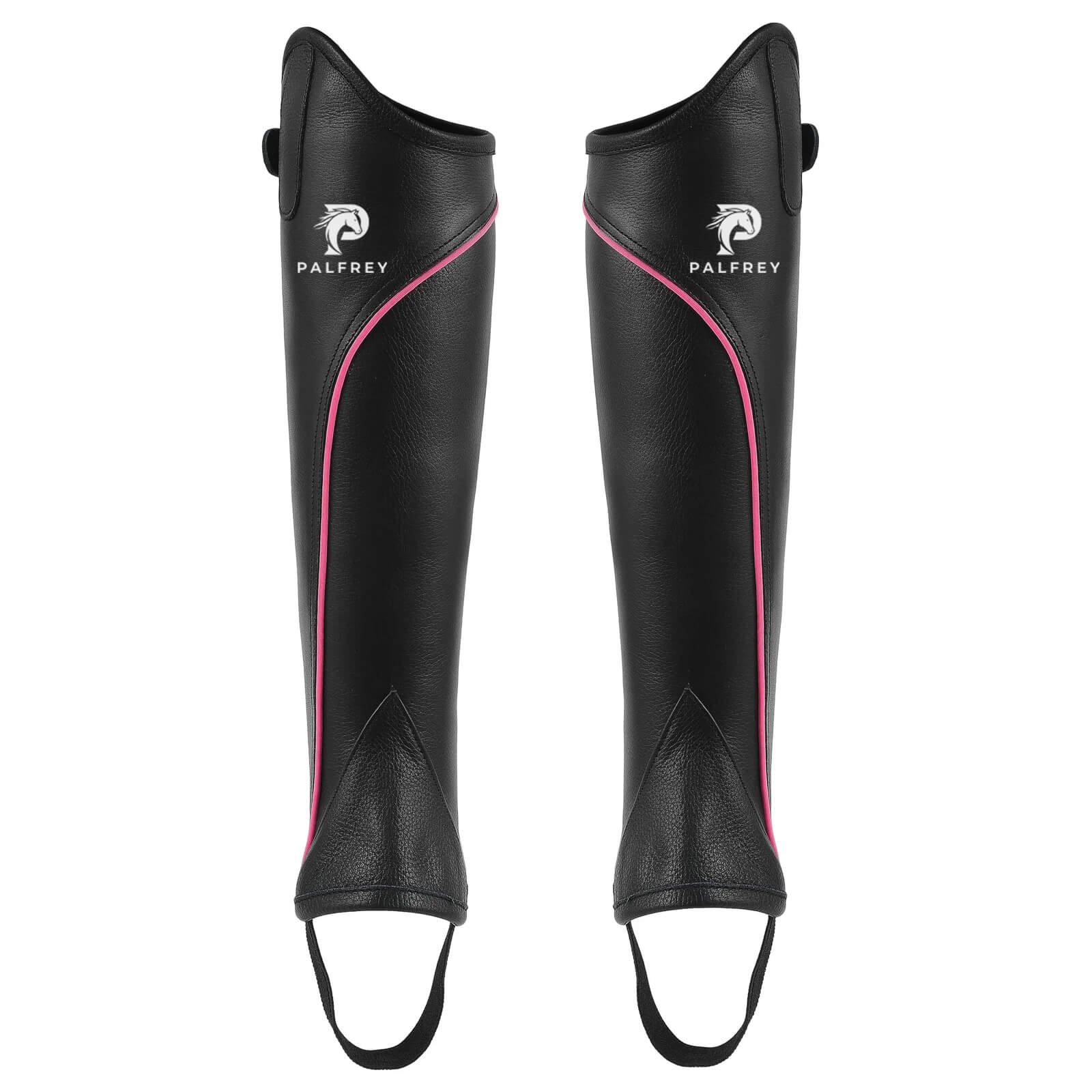 Palfrey Leather Half Chaps with Pink Piping are stylish black equestrian leg protectors featuring a distinctive pink accent stripe. Made from durable leather with elastic foot straps and secure calf closure system. These half chaps protect the rider’s lower leg while adding a fashionable touch to traditional riding gear. Perfect for English riding, dressage, and show jumping, they provide grip, stability, and a polished appearance when paired with short paddock boots.